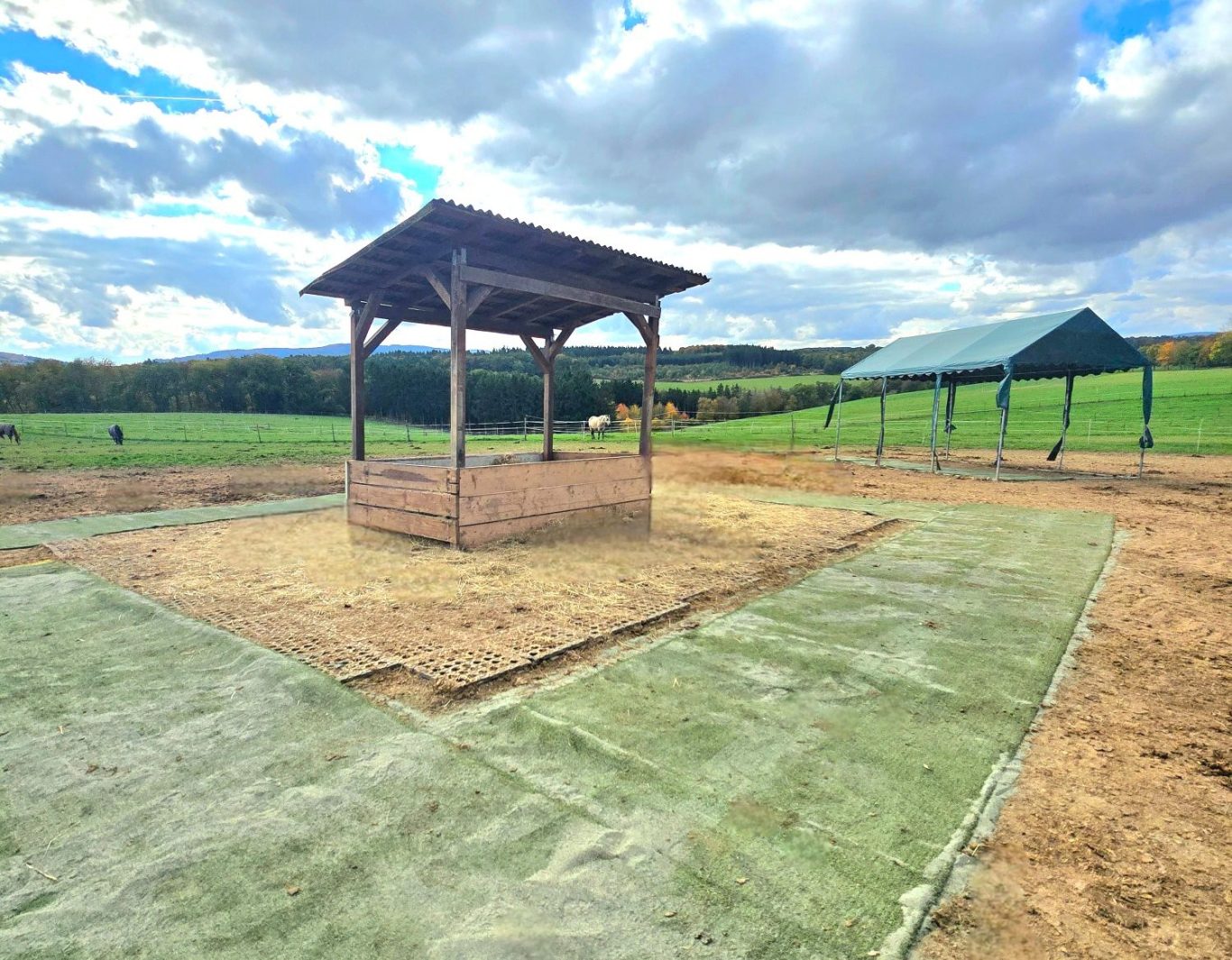 Alle Paddocks verfügen über eine Frischwassertränke, eine überdachte Heuraufe mit befestigtem Boden, Weidezelt und Liegeflächen, sowie direktangrenzede Weiden.