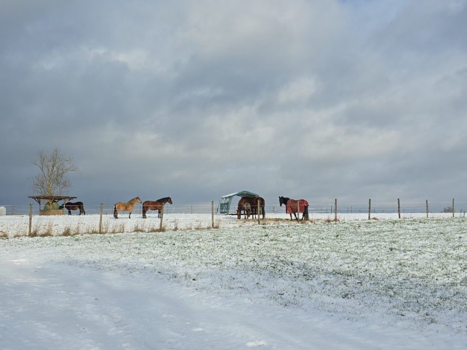 Dabei sind uns Bewegung und Ruhe sehr wichtig. Die Pferde kommen täglich mindestens halbtags, aber hauptsächlich ganztags auf die weitläufigen Koppeln. Nachts können die großzügigen Paddockboxen oder Wahlweise auch die Offenstallflächen gewählt werden.